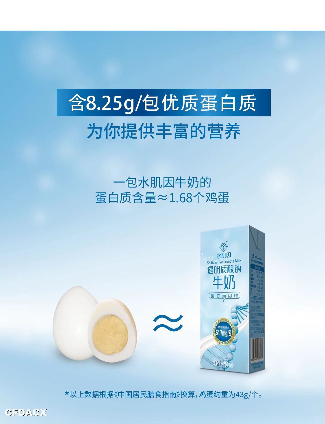 新疆蒙牛乳業(yè)依托其自身乳制品先進技術(shù),利用新疆優(yōu)質(zhì)奶源資源攜手知名生物科技公司華熙生物強勢推出國內(nèi)首款玻尿酸牛奶-"水肌因",據(jù)悉,"水肌因"玻尿酸新品牛奶,其乳蛋白含量達到3.3mg/100ml、透明質(zhì)酸鈉(玻尿酸)添加量≧50mg/包,產(chǎn)品甄選優(yōu)質(zhì)新疆奶源,口感濃厚鮮香。